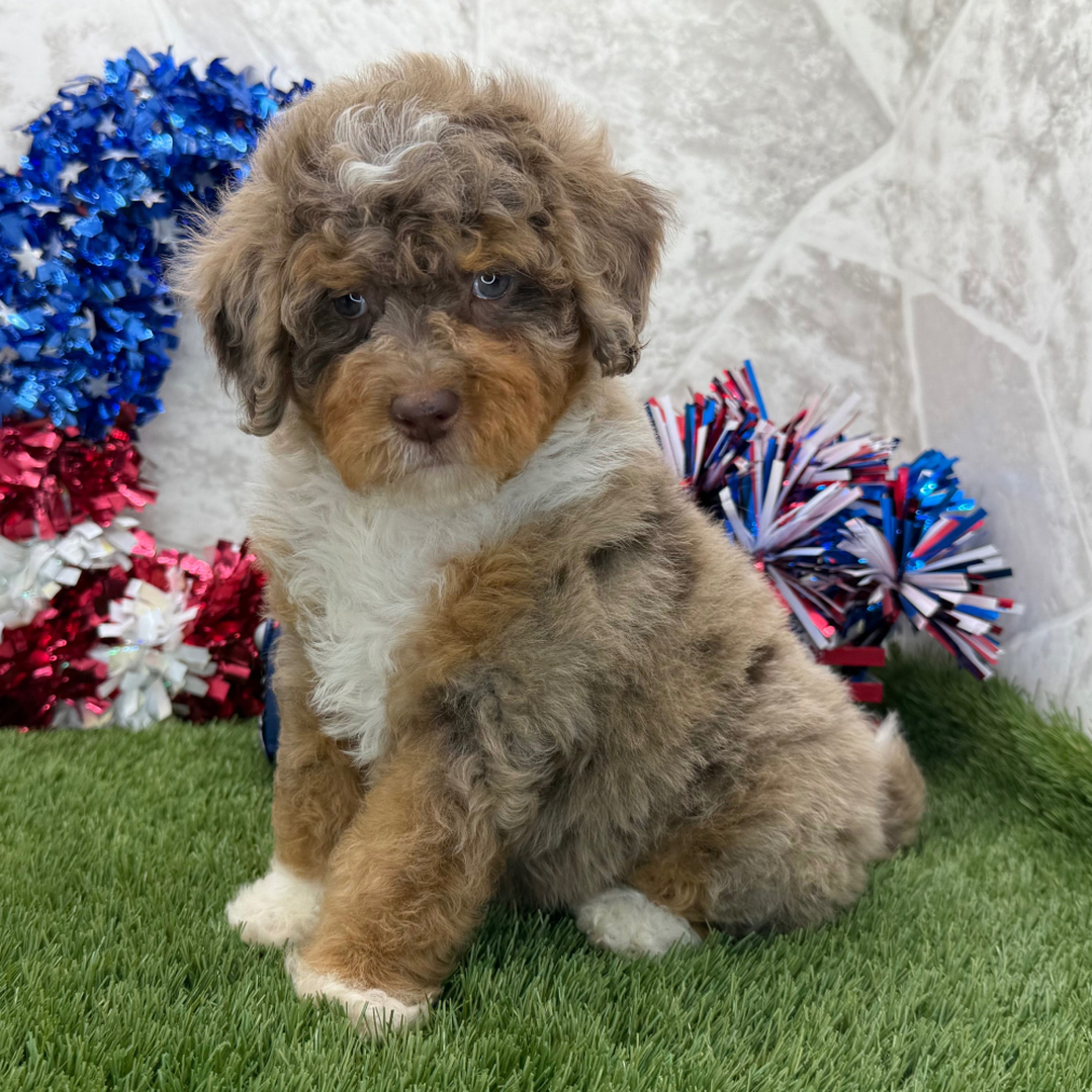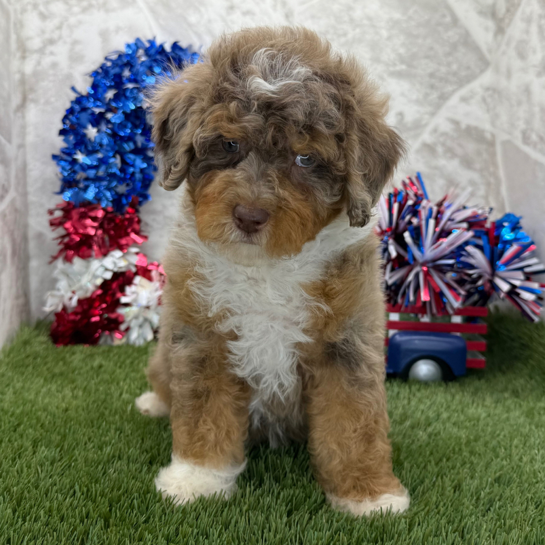 Hi, I’m Cheyenne! I’m a 9-week-old female Bernedoodle with a beautiful blue merle, white & tan coat, born on April 22, which makes me a Taurus pup. I am ready now to plan my trip to my forever family. I’m CKC registered. I want you to want me, I need you to need me, and I’d love you to love me… forever together.