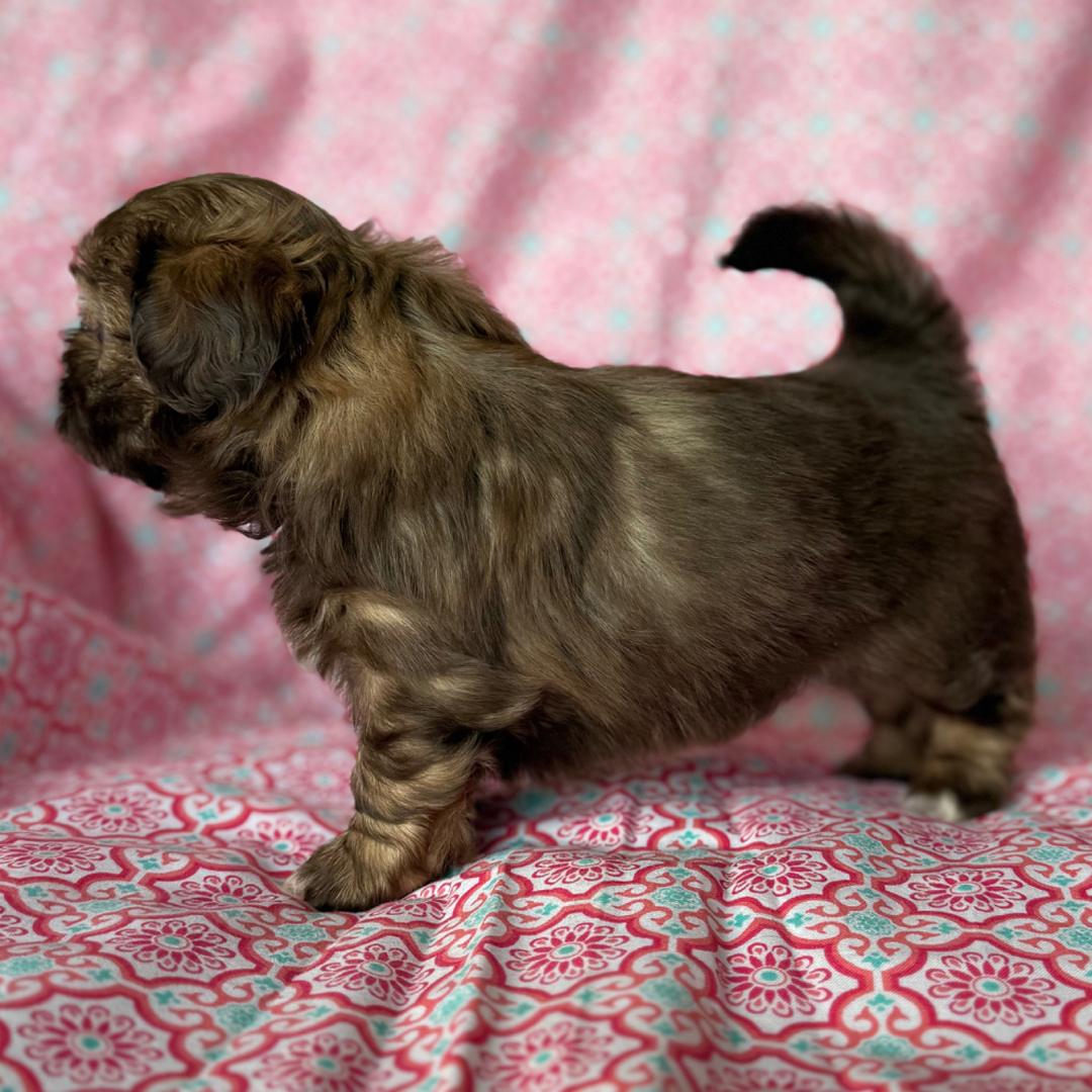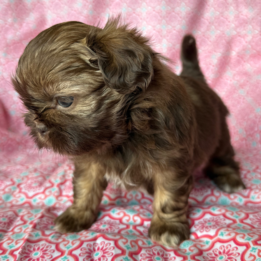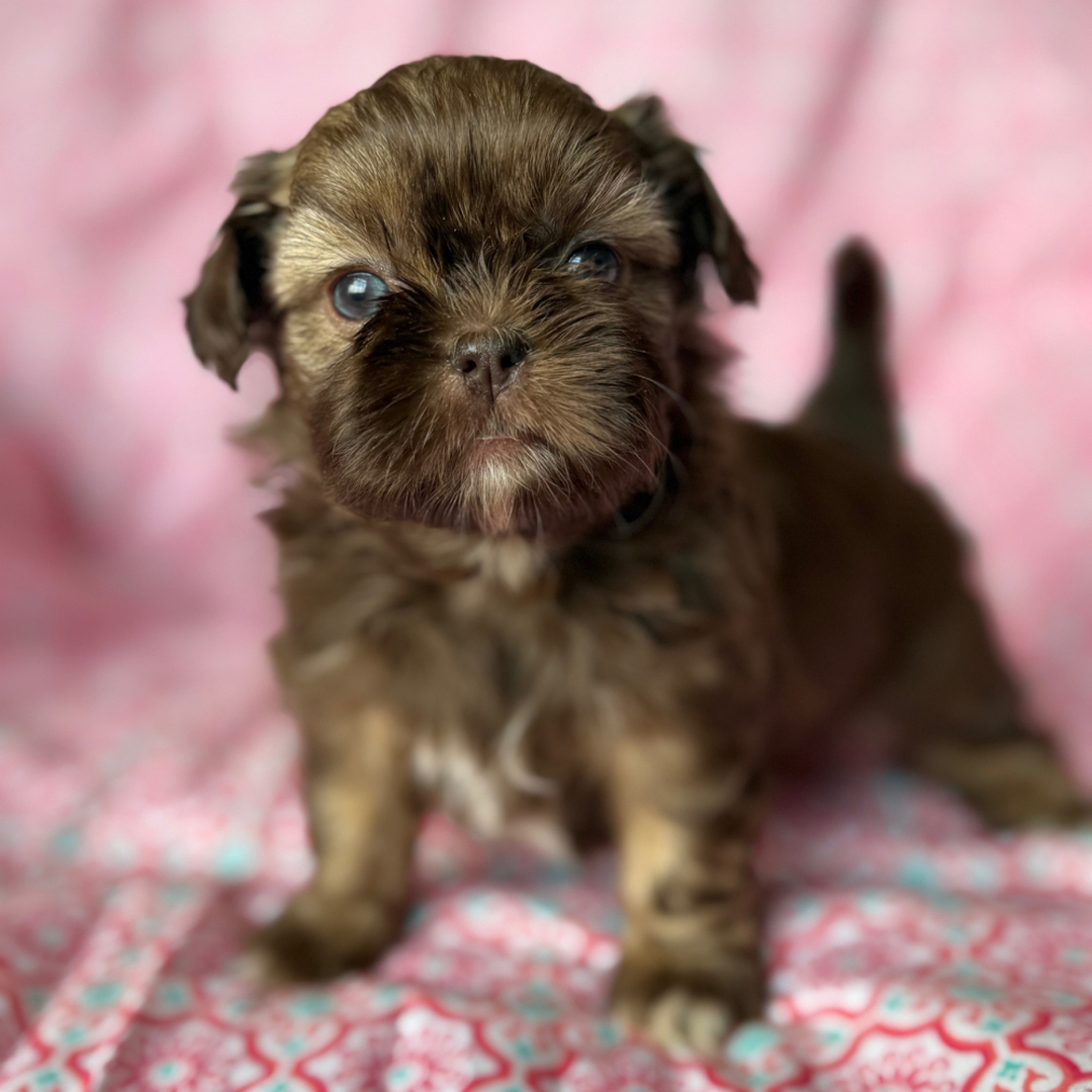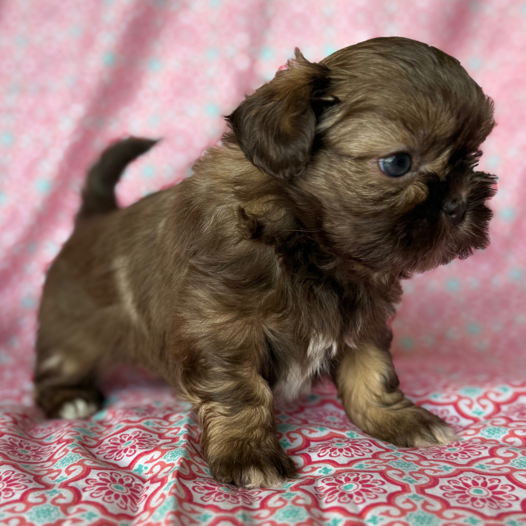 Hi, I’m Cupcake! I’m a 6-week-old female Shih Tzu with a beautiful liver coat, born on May 9, which makes me a Taurus sign. I’ll be ready to go home to my forever family after July 5, once I’m grown enough to leave my litter. When I reach my adult size, I should weigh between 7–9 lbs. I’m AKC registered. My favorite hobbies include playing, napping, and making people laugh.