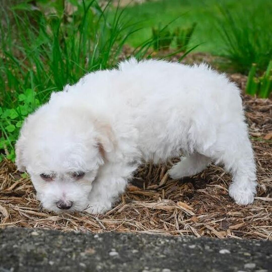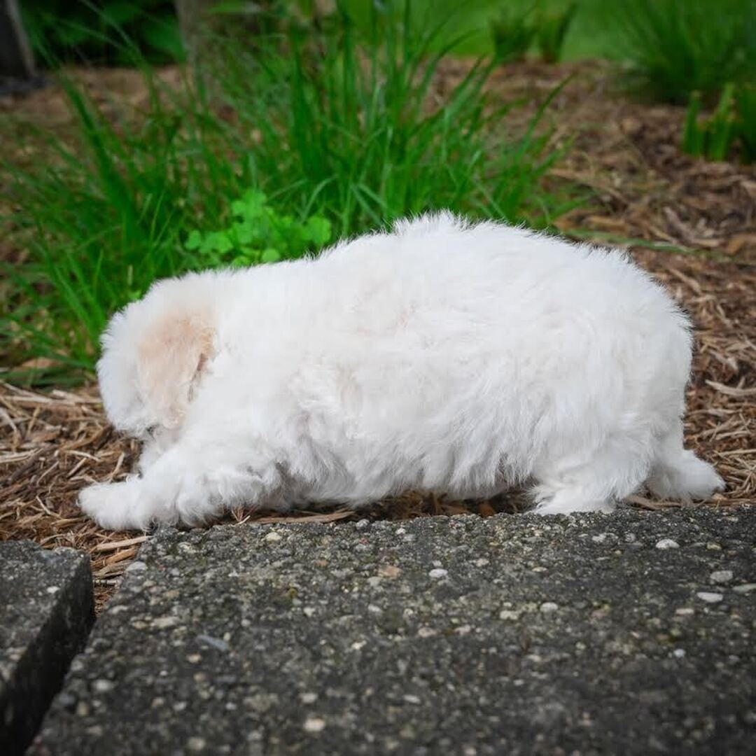 Hi, I’m Eddie! I’m an 8-week-old male Bichon Frise with a beautiful white coat, born on April 26, which makes me a Taurus pup. I am ready now to plan my trip to my forever family. Once I reach my adult size, I’m expected to weigh between 10–12 lbs. I’m AKC registered. I want you to want me, I need you to need me, and I’d love you to love me… forever together.