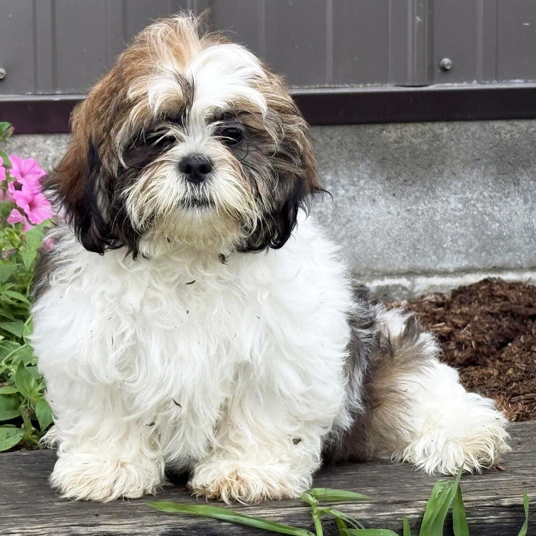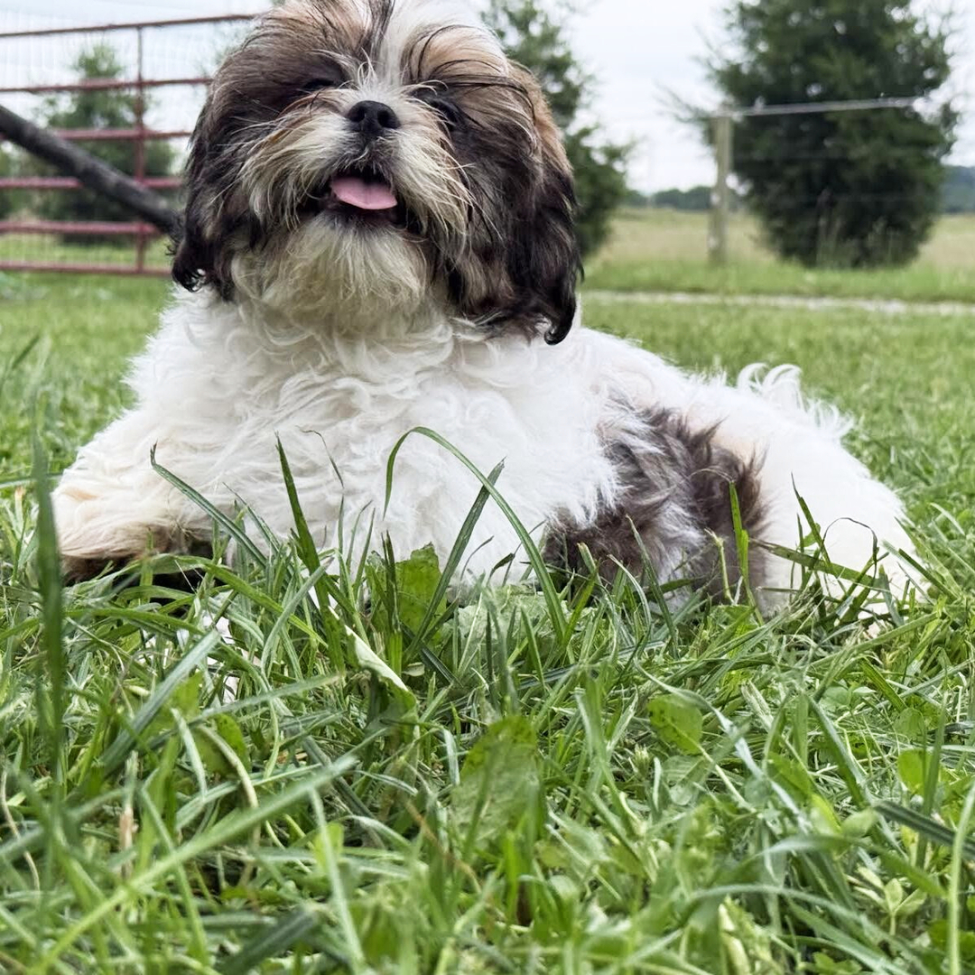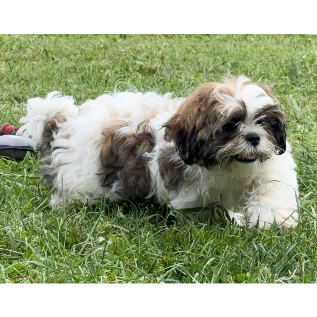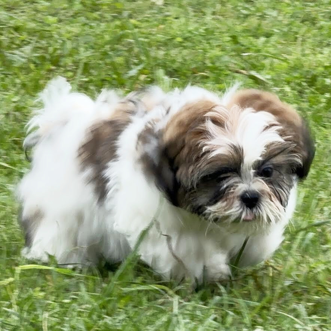 Hi, I’m Lavinia! I’m a 15-week-old female Shih Tzu with a beautiful brindle & white coat, born on March 6, which makes me a Pisces pup. I am ready now to plan my trip to my forever family. Once I reach my adult size, I’m expected to weigh between 14–16 lbs. I’m AKC registered. My favorite hobbies include playing, napping, and making people laugh.