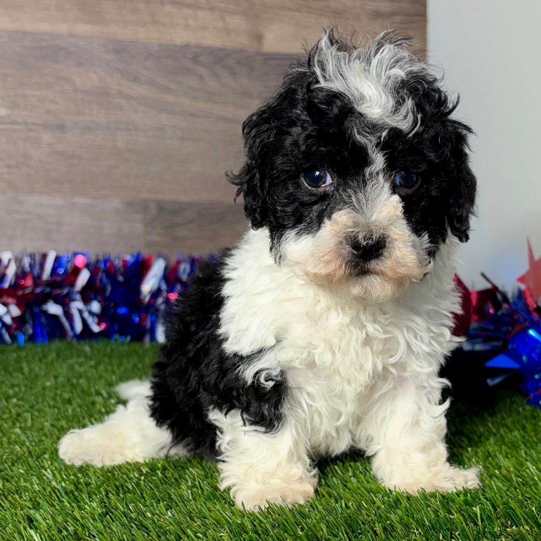 Hi, I’m Maverick! I’m an 8-week-old male Maltipoo with a beautiful black & white coat, born on April 30, which makes me a Taurus sign. I’ll be ready to go home to my forever family after June 25, once I’m grown enough to leave my litter. When I reach my adult size, I should weigh between 6–12 lbs. My bags are packed because my breeder told me that I am going to go start the adventure of my life with my forever family.