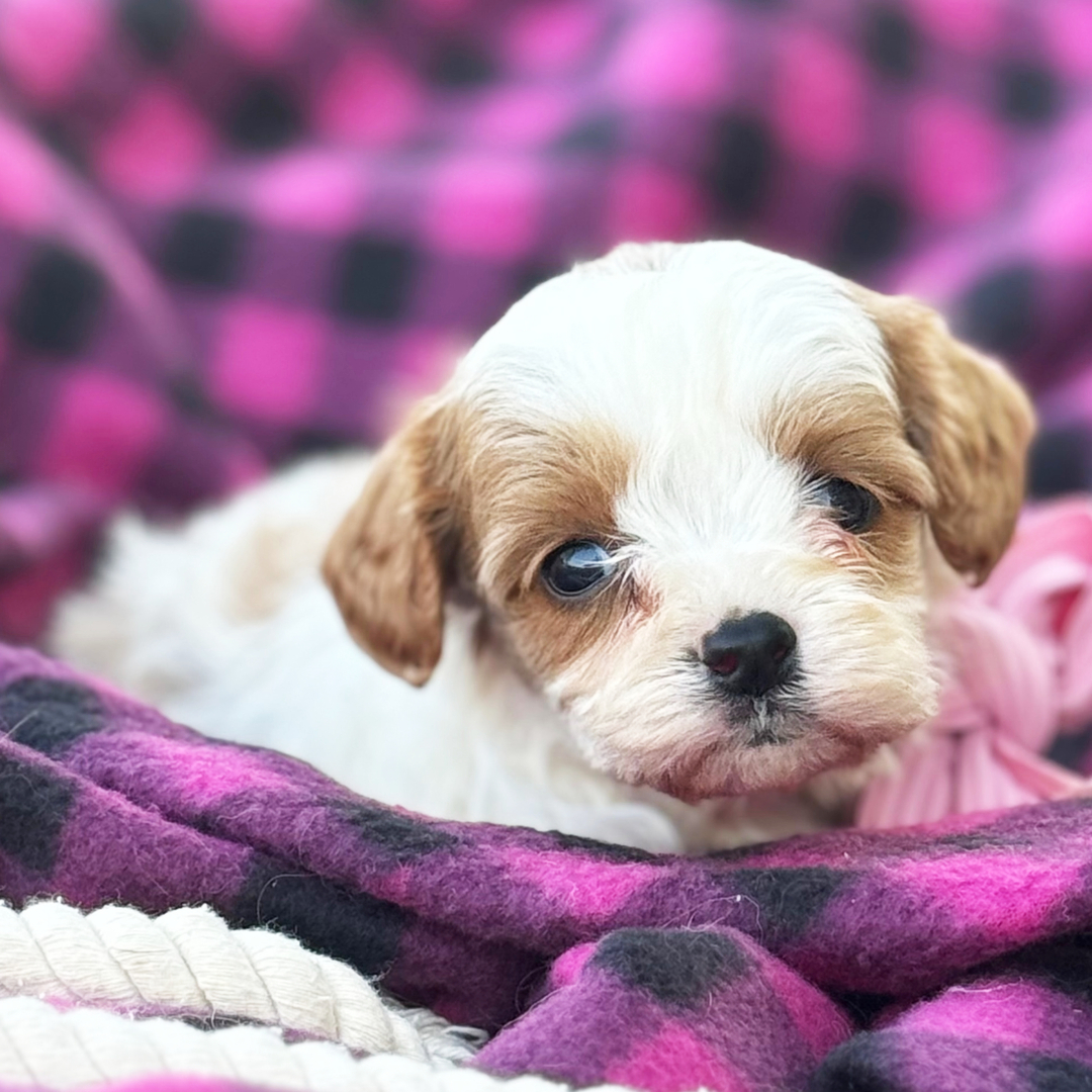 Hi, I’m Penelope! I’m a 4-week-old female Cavapoo with a beautiful red & white coat, born on May 27, which makes me a Gemini sign. I’ll be ready to go home to my forever family after July 22, once I’m grown enough to leave my litter. When I reach my adult size, I should weigh between 9–10 lbs. My favorite hobbies include playing, napping, and making people laugh.